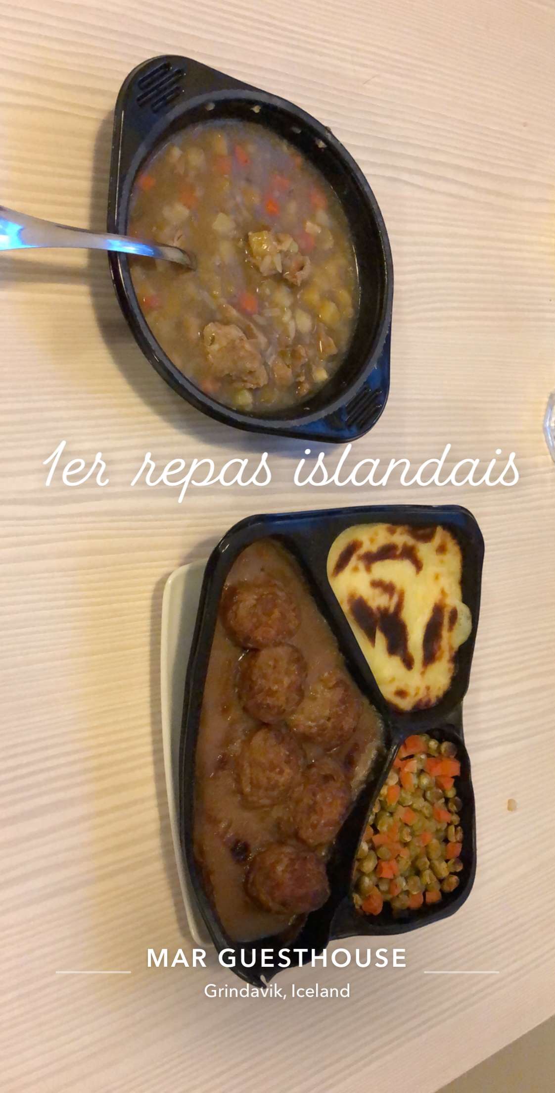 Nous entamons donc notre premier repas, il s’agit de plats préparés car nous ne savions pas si notre chambre était équipée d’une kitchenette. Alors nous avons là une soupe d’agneau ainsi que des boulettes de boeuf, pas très fameux mais ça passait très bien pour notre première nuit.