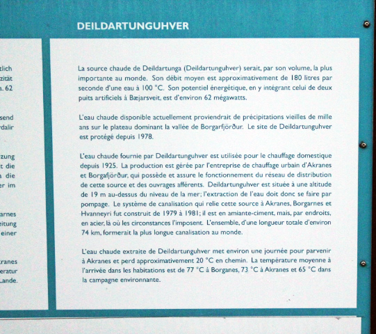 Deildartunguhver est la source d’eau chaude la plus puissante d’Europe. Il fournit 180 l/s d’eau chaude à 100 ° C. La majeure partie de l’eau utilisée pour le chauffage central dans les villes de Borgarnes et d’Akranes provient de Deildartunguhver. La canalisation d’eau chaude menant à Akranes a une longueur de 64 km, la plus longue d’Islande. Elle atteint environ 78 à 80 degrés lorsqu’elle atteint Akranes.