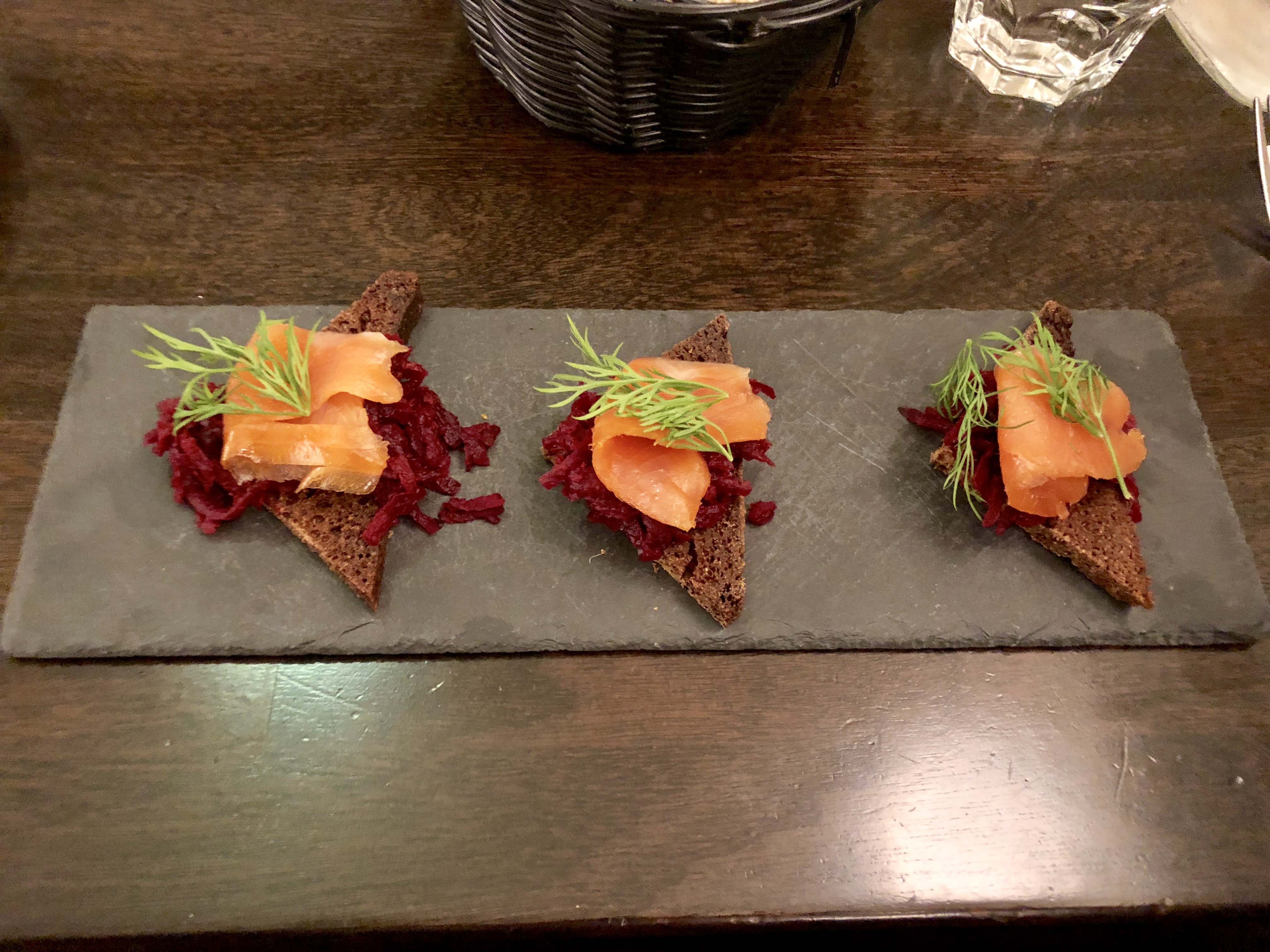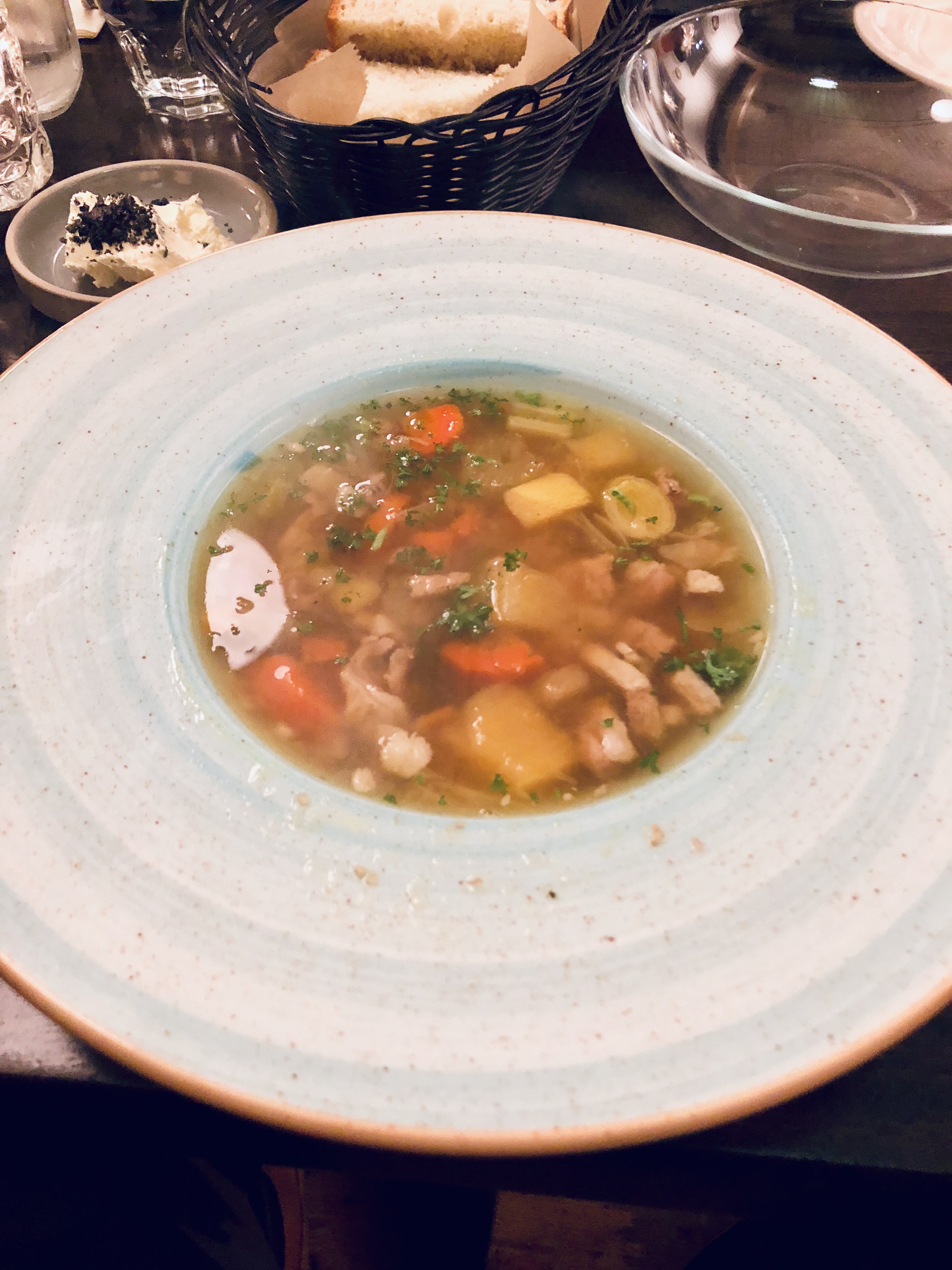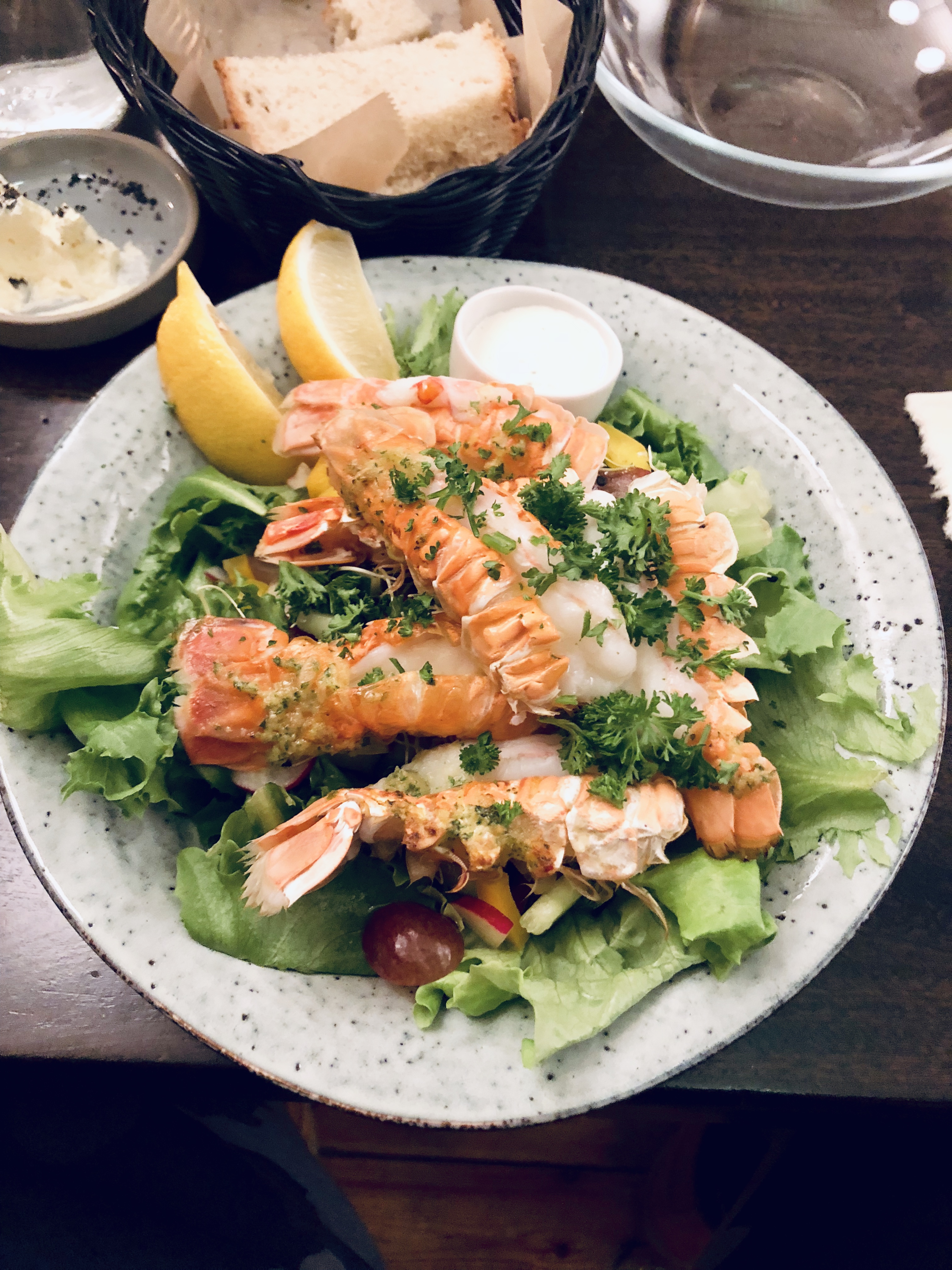Nous avons pris 2 entrées (une soupe de mouton et toasts de saumon sur un pain de seigle), la soupe est servie avec un beurre maison et un pain brioché, pour la suite du repas nous avons pris une salade de langoustine et de l’agneau grillé et pour terminer un skyr. Le total de cette soirée s’élève à environ 80€ mais tout était très bon et les plats très copieux :