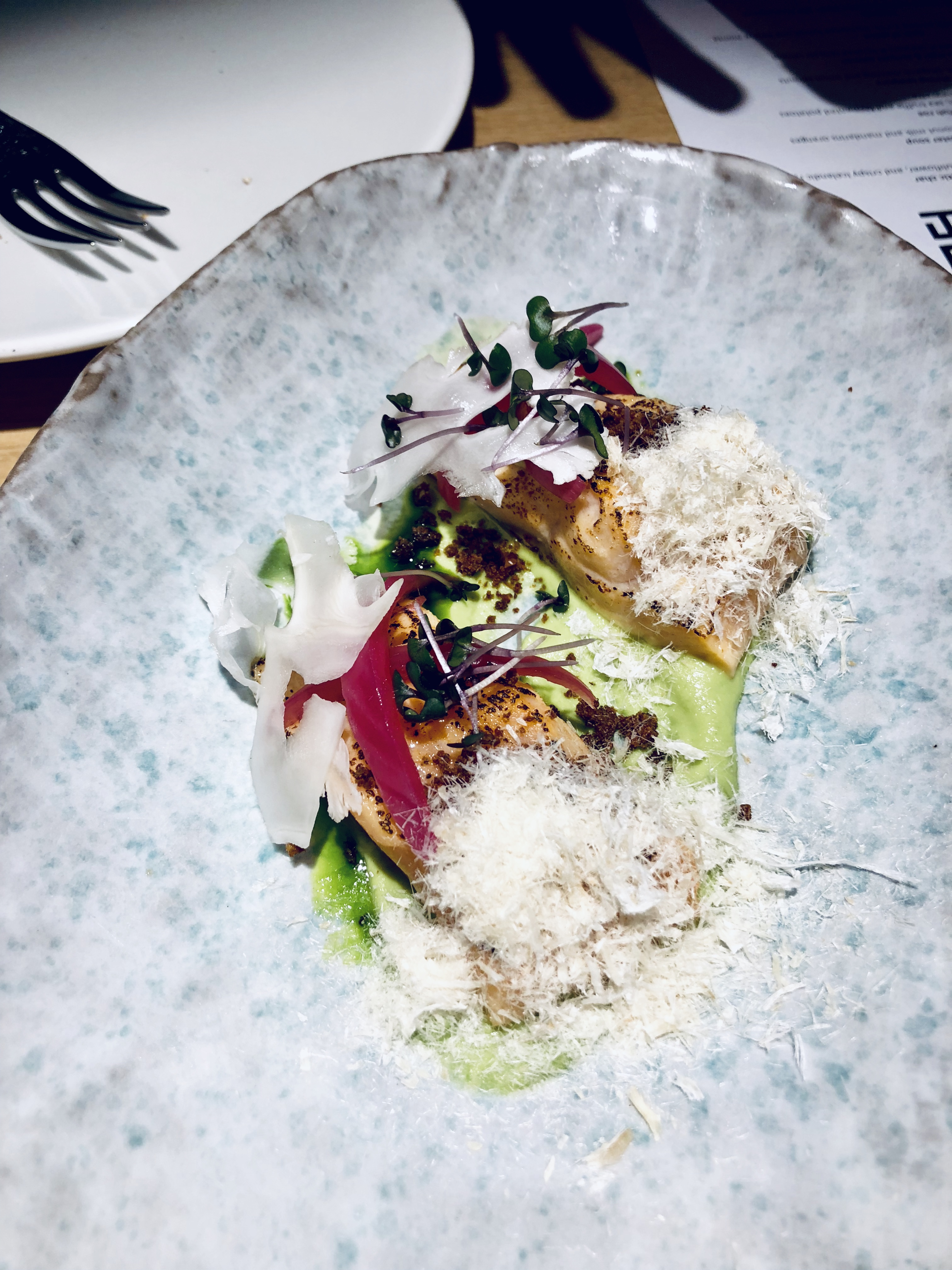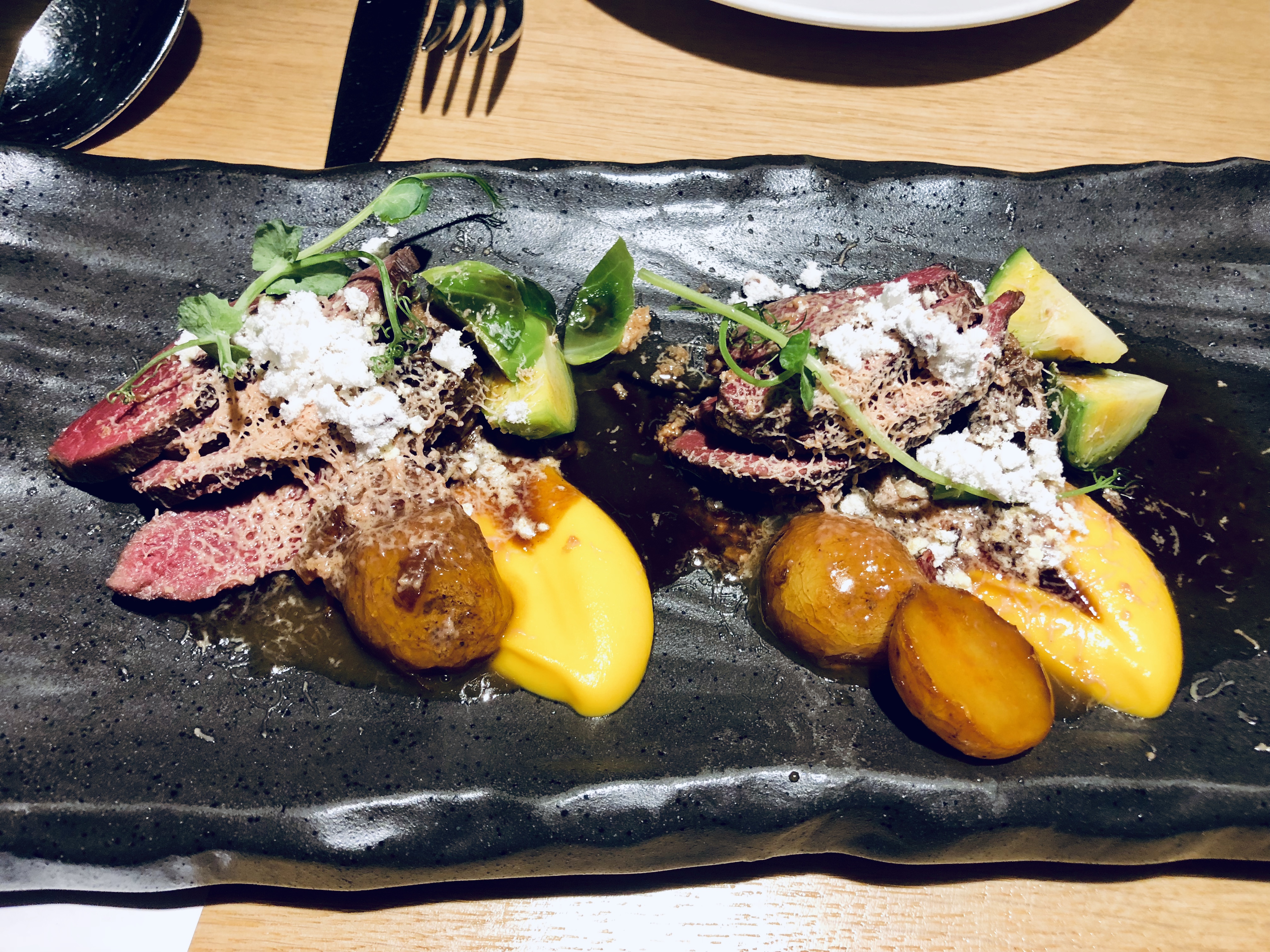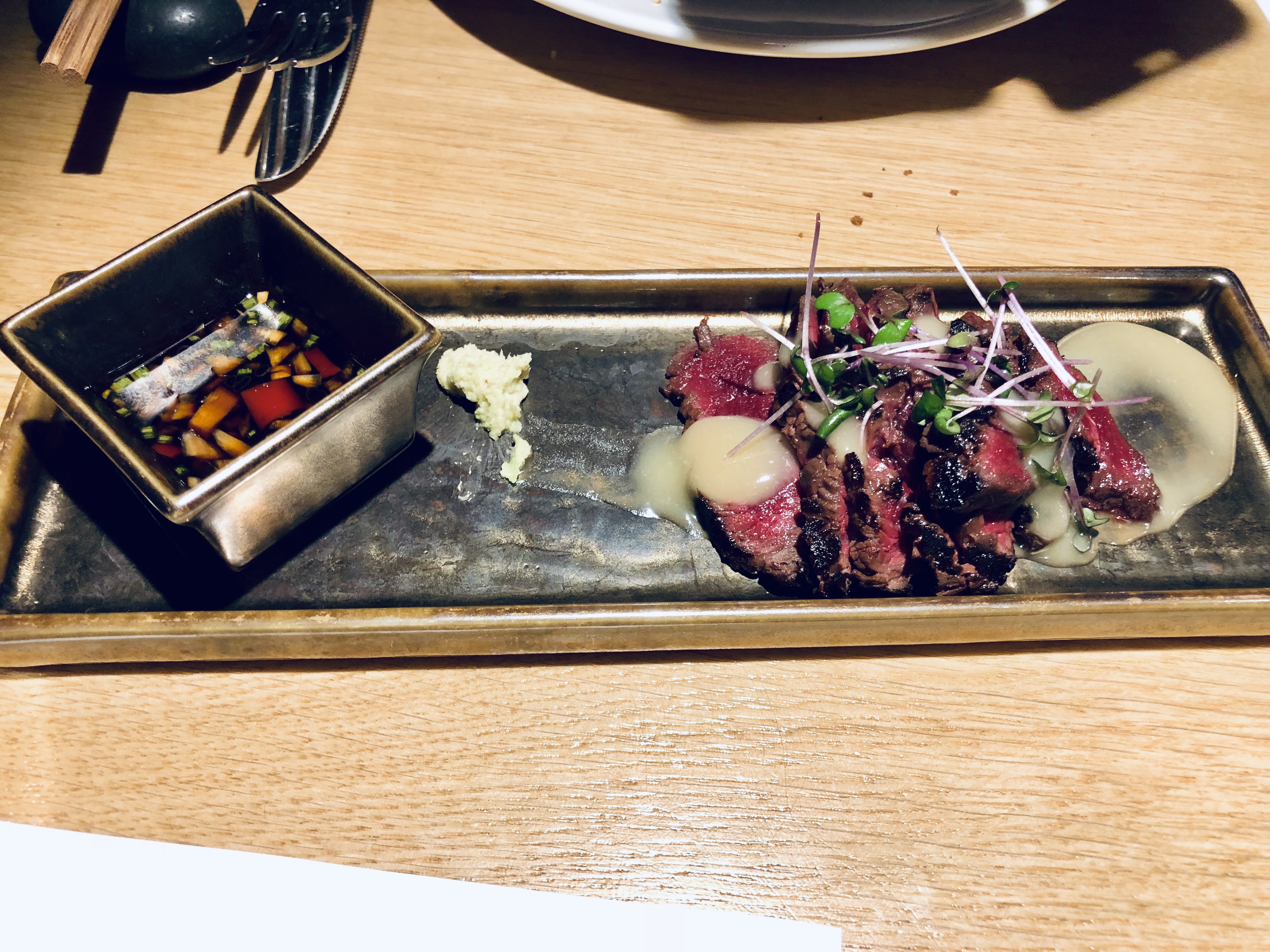 - Petit rorqual grillé robata légèrement grillé et servi avec de la racine de wasabi d’Islande, du miso aux agrumes et du gingembre soja
