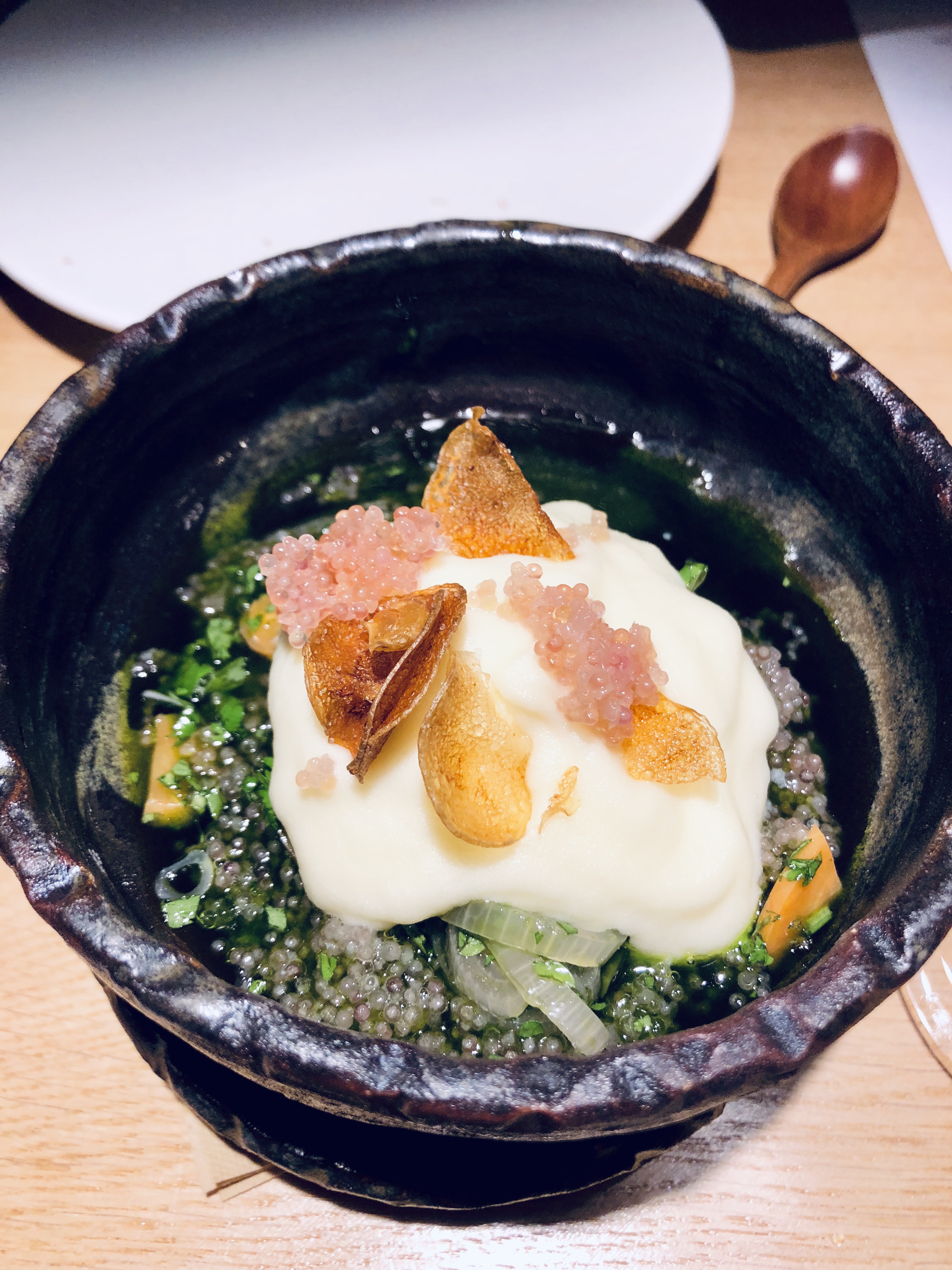 - œufs de lompe servis avec cerfeuil, oignons au vinaigre, truffe de mer et vinaigrette aux pommes de terre fermentées