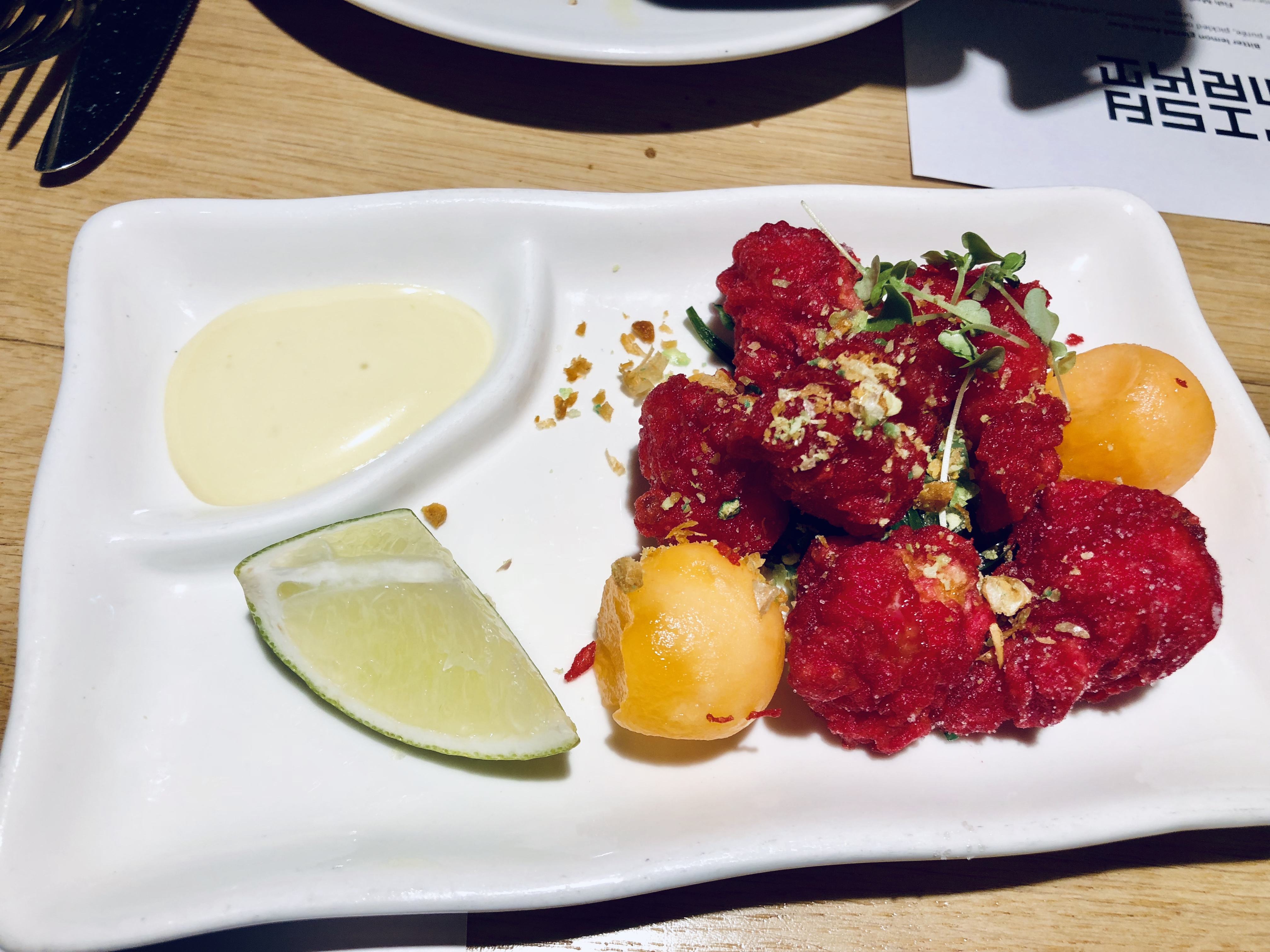 - Tempura de crevettes géantes au melon sucré, vinaigrette jalapeno et germes d’oignons