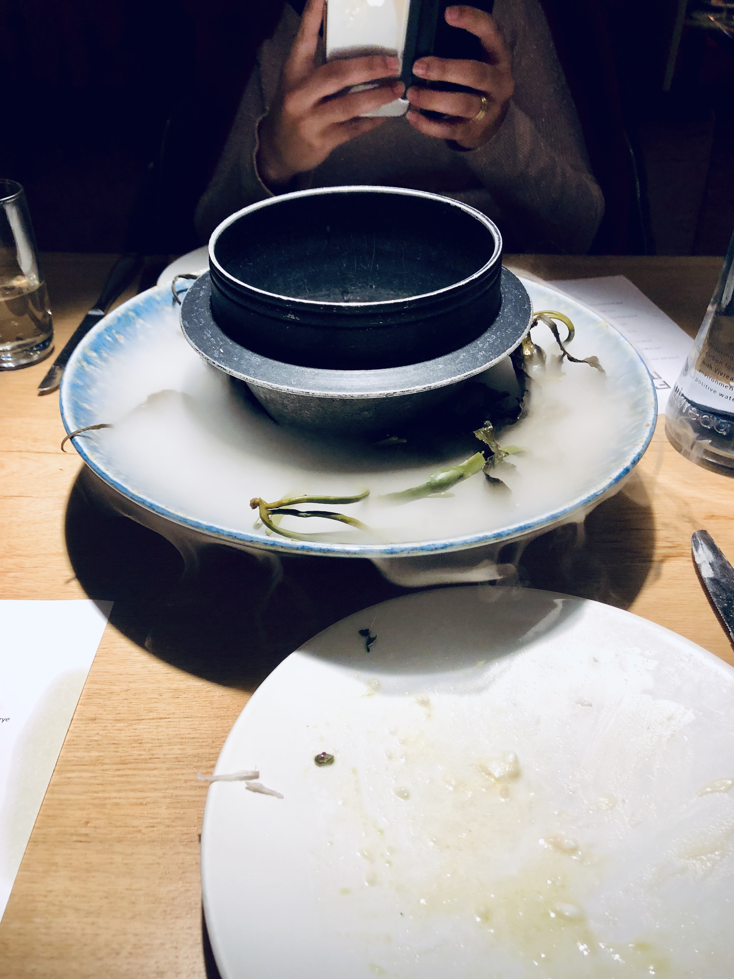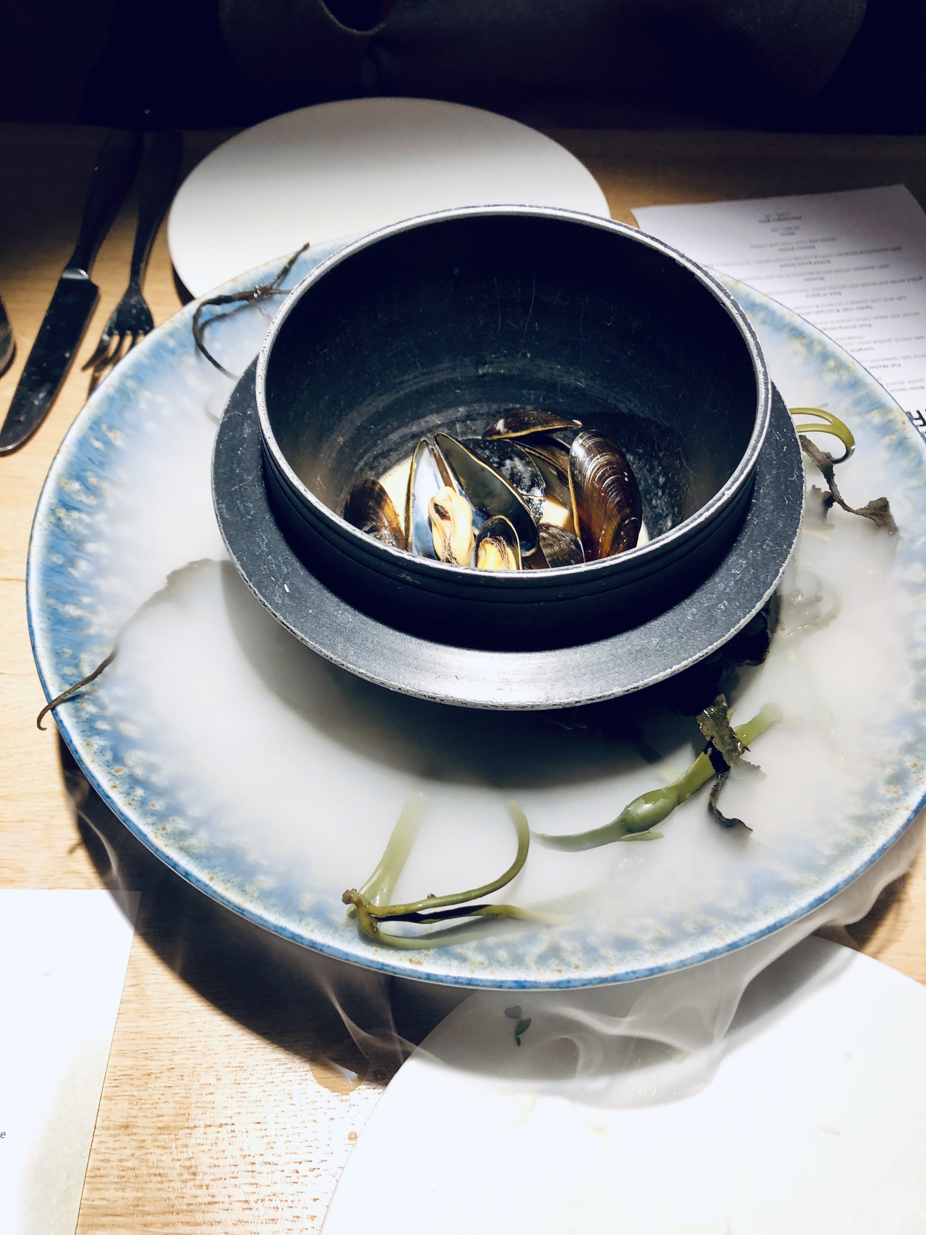 - Bière de moules cuite à la vapeur, servie avec un bouillon de langoustine et du mascarpone